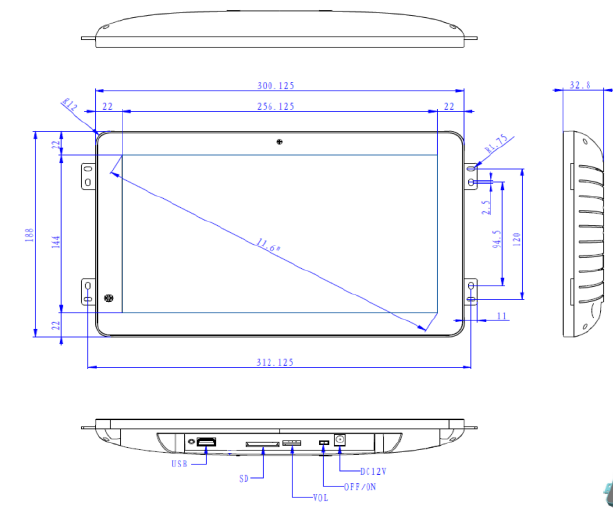 Screen size: 11.6inch, Screen type: Non-Touchscreen, LCD Panel Type: LCD Panel, LCD Panel resolution: 1366*768, Housing type: Closed plastic housing, Operation System: Android 5.1 - Rockchip RK3288, Quad Core Cortex A17, 1.8G, Rooted, Interface - Connection portals: SD Cardreader, USB Portal, LAN input for Internet connection - RJ45, 3.5mm Jack, Power Input DC 12V/1.5A, Network options: Wifi, LAN network, Bluetooth 4.0, Memory: RAM 1GB - Internal Memory 8GB, Start-Up: AutoStart by plug-in the power-adapter, Speakers: Internal Speakers: 2x 2W-8Ohm, Camera: 2.0MP front camera