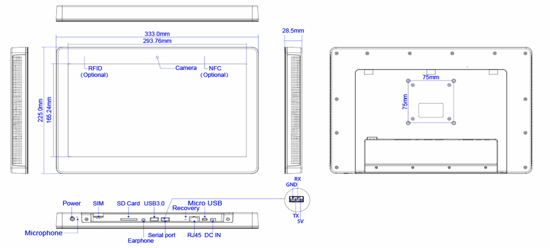 Screen size: 13.3inch, Screen type: Touchscreen - Capacitive, LCD Panel Type: IPS Panel, LCD Panel resolution: 1920*1080, Ratio: 16:9, Operation System: Rooted, Operation System: Android 11 - RockChip RK3566, Operation System: CPU Quad Core Coretex A55, Interface - Connection portals: SD Cardreader, Interface - Connection portals: USB Portal, Interface - Connection portals: LAN input for Internetconnection - RJ45, Interface - Connection portals: Micro USB Portal, Interface - Connection portals: 3.5mm Jack, Interface - Connection portals: RJ45, Resolution Internal VideoPlayer: 1080P, Housing type: Black - Black, Usage: 24/7, Network options: Wifi, Network options: LAN/WLAN, Network options: Bluetooth 4.0, Speakers: 2*3W, Memory: RAM 2GB -Internal Memory 16GB, Camera: 5.0MP front camera, PowerAdapter: AC/DC 12V/2A