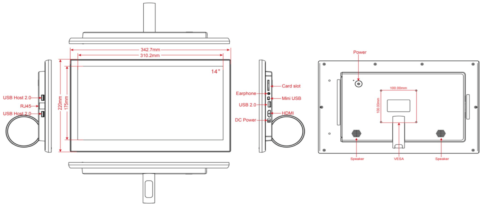 Screen type: Non-Touchscreen, Operation System & CPU: Android 8.1 - Rockchip RK3288, Rooted, Quad Core Cortex A17, 1.8G, Screen size: 14inch, Housing type: Closed Plastic Frame, LCD Panel resolution: 1920*1080, Ratio: 16:9, LCD Panel Type: IPS Panel, Resolution Internal VideoPlayer: 1920*1080, Interface - Connection portals: LAN input for Internet connection - RJ45, Mini USB Portal, Power Input DC 12/3A, HDMI OUT, SD/MMC Cardreader, USB Portal, 3.5mm Jack, Mounting options: VESA 75x75mm - screwholes 4mm, Network options: LAN/WLAN, Wi-Fi, Bluetooth 4.0, Memory: RAM 2GB - Internal Memory: 16GB, Start-Up: AutoStart by plug-in the power-adapter, Usage: 24/7, PowerAdapter: AC/DC 12V/3A, Camera: 2.0MP front camera, Color: Black, Speakers: Internal Speakers: 2x 2W-8Ohm, Certificates: CE/FCC/ROHS