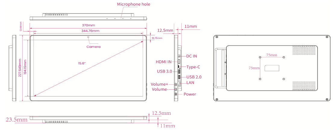 Screen size: 15.6inch, Screen type: Touchscreen - Capacitive, LCD Panel Type: IPS Panel, LCD Panel resolution: 1920*1080, Ratio: 16:9, Optional Features: Software Systems for Digital Signage & Kiosks, Optional Features: PoE function, Operation System: Rooted, Operation System: OS13 - RK3588S2, Interface - Connection portals: HDMI IN, Interface - Connection portals: HDMI OUT, Interface - Connection portals: USB Portal, Interface - Connection portals: LAN input for Internetconnection - RJ45, Interface - Connection portals: 3.5mm Jack, Interface - Connection portals: Power Input DC 12V/1.5A, Interface - Connection portals: USB Type C, Resolution Internal VideoPlayer: 1920*1080, Frame Housing type: Closed Plastic Frame, Start-Up: AutoStart by plug-in the power-adapter, Usage: 24/7, Network options: Wifi, Network options: Mobile Network (3G-4G) - Optional by USB SIM Dongle, Network options: Ethernet: 100Mbps, Network options: RJ45, Network options: Bluetooth 5.3, Speakers: 2*3W, Mounting options: VESA 75x75mm - screwholes 4M, Memory: 4GB-64GB, Camera: 5.0MP front camera, PowerAdapter: AC/DC 12V/1.5A