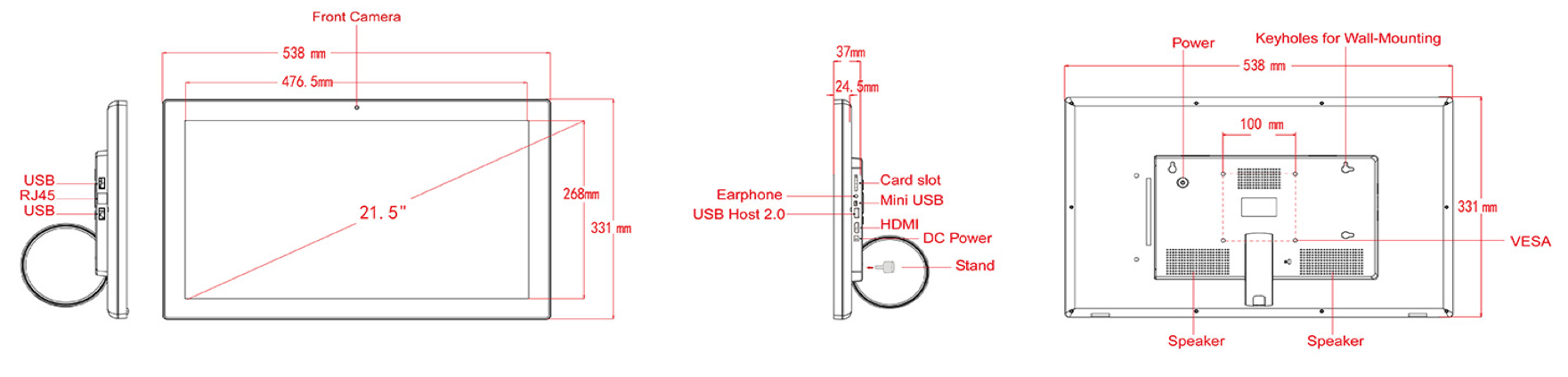 Housing type: Closed Plastic Frame, Screen size: 21.5inch, Screen type: Non-Touchscreen, LCD Panel Type: LCD, LCD Panel resolution: 1920*1080, Resolution Internal VideoPlayer: 1920*1080, Operation System & CPU: Rooted, Dual Core A72, Quad Core A53, RockChip RK3399, Android 7.1, Memory: RAM 2GB - Internal Memory: 16GB, Network options: LAN/WLAN, Mobile Network (3G-4G) - Optional by USB SIM Dongle, Bluetooth 4.0, Wifi, Interface - Connection portals: USB Portal, Mini USB Portal, HDMI OUT, 3.5mm Jack, SD Cardreader, LAN, Power Input DC 12V/3A, Camera: 2.0MP front camera, Speakers: 2x 3W, Mounting options: VESA 100x100mm - screwholes 4mm, Ratio: 16:9, Optional Features: Software Systems for Digital Signage & Kiosks, 3G Network via USB-SimCard Dongle, Start-Up: AutoStart by plug-in the power-adapter, Usage: 24/7, PowerAdapter: AC/DC 12V/3A