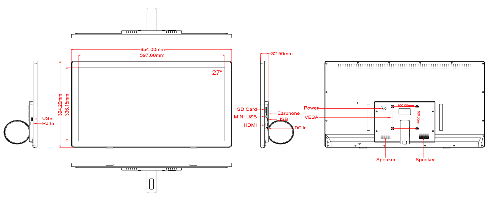 Screen size: 27inch, Screen type: Touchscreen - Capacitive, LCD Panel Type: LCD, LCD Panel resolution: 1920*1080, Ratio: 16:9, Optional Features: Software Systems for Digital Signage & Kiosks, 3G Network via USB-SimCard Dongle, Operation System: Rooted, Android 11 - RockChip RK3568, CPU Quad Core Coretex A55, Interface - Connection portals: LAN, HDMI OUT, SD Cardreader, USB Portal, Mini USB Portal, 3.5mm Jack, Power Input DC 12V/4A, Resolution Internal VideoPlayer: 1920*1080, Housing type: Closed Plastic Frame, Start-Up: AutoStart by plug-in the power-adapter, Usage: 24/7, Network options: Wifi, LAN/WLAN, Mobile Network (3G-4G) - Optional by USB SIM Dongle, Bluetooth, Speakers: 2x 3W, Mounting options: VESA 100x100mm - screwholes 4mm, Memory: RAM 2GB - Internal Memory: 16GB, Camera: 5.0MP front camera, PowerAdapter: AC/DC 12V/4A