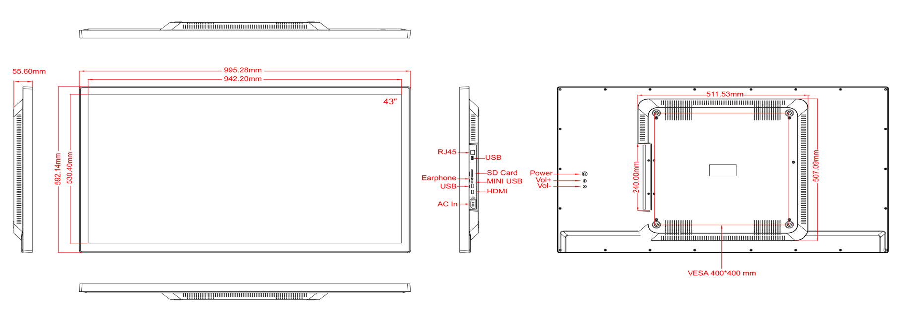Housing type: Closed Plastic Frame, Screen size: 43inch, Screen type: Non-Touchscreen, LCD Panel Type: LCD, LCD Panel resolution: 1920*1080, Resolution Internal VideoPlayer: 1920*1080, Operation System & CPU: Rooted, Dual Core A72, Quad Core A53, RockChip RK3399, Android 7.1, Memory: RAM 2GB - Internal Memory: 16GB, Network options: LAN/WLAN, Bluetooth 4.0, Wifi, Interface - Connection portals: USB Portal, Mini USB Portal, HDMI OUT, 3.5mm Jack, SD Cardreader, LAN input for Internetconnection - RJ45, Power Input AC100V-240V, Speakers: 2x 5W, Mounting options: VESA 400x400mm, Ratio: 16:9, 3G Network via USB-SimCard Dongle, Start-Up: AutoStart by plug-in the power-adapter, Usage: 24/7, PowerAdapter: AC 100-240V