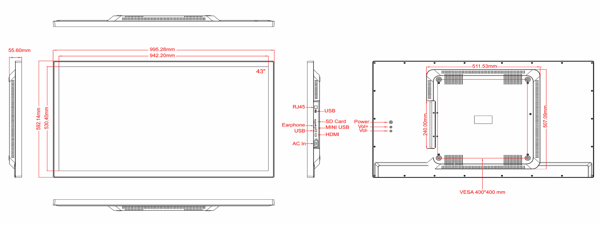 Screen size: 43inch, Screen type: Touchscreen - Capacitive, LCD Panel Type: LCD, LCD Panel resolution: 1920*1080, Ratio: 16:9, Optional Features: Software Systems for Digital Signage & Kiosks, 3G Network via USB-SimCard Dongle, Operation System: Rooted, Android 11 - RockChip RK3568, CPU Quad Core Coretex A55, Interface - Connection portals: HDMI OUT, SD Cardreader, USB Portal, Mini USB Portal, Power Input AC100V-240V , LAN input for Internetconnection - RJ45, 3.5mm Jack, Resolution Internal VideoPlayer: 1920*1080, Housing type: Closed Plastic Frame, Start-Up: AutoStart by plug-in the power-adapter, Usage: 24/7, Network options: Wifi, LAN/WLAN, Mobile Network (3G-4G) - Optional by USB SIM Dongle, Bluetooth, Speakers: 2x 5W, Mounting options: VESA 400x400mm, Memory: RAM 2GB - Internal Memory: 16GB, PowerAdapter: AC 100-240V
