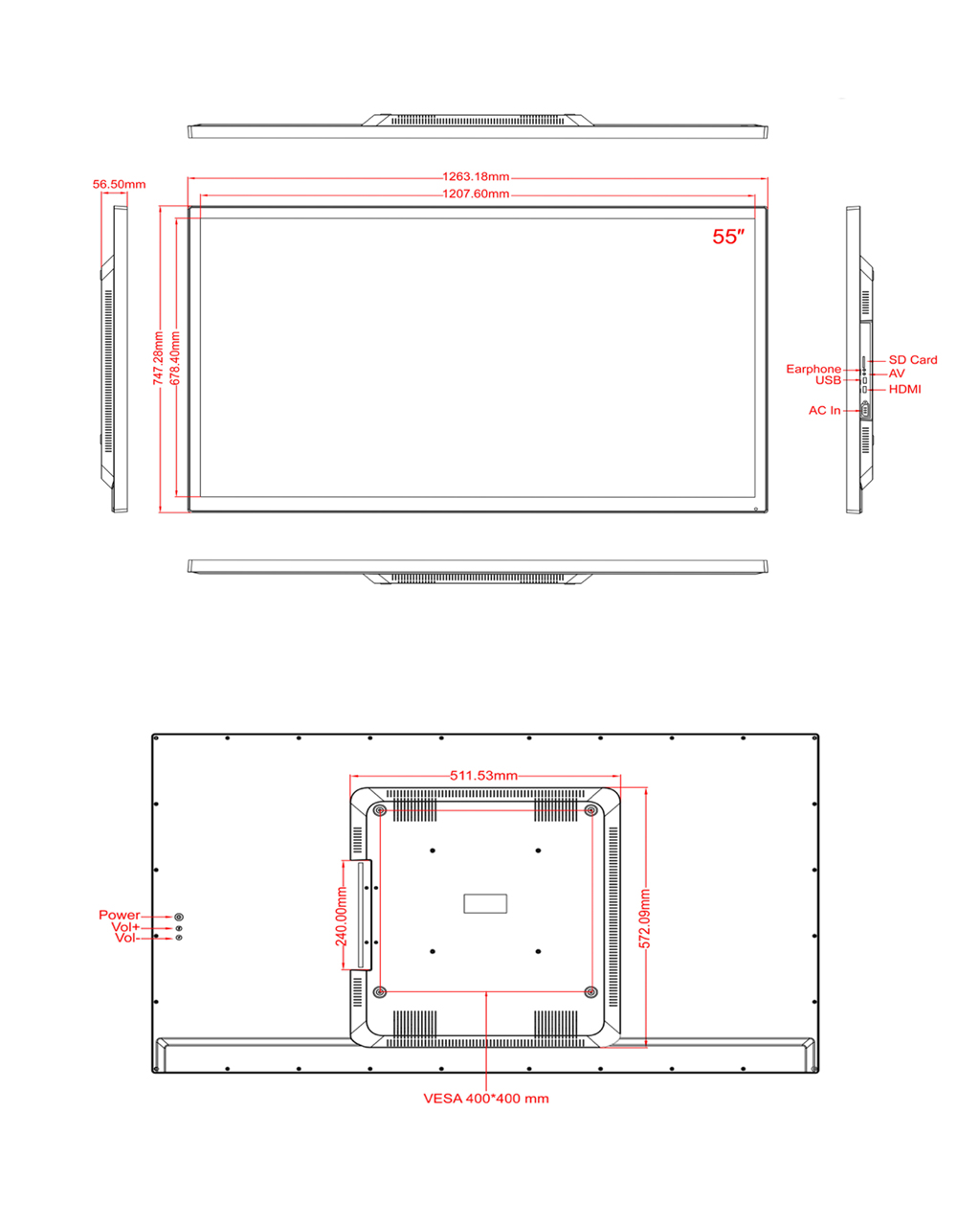 Screen type: LCD screen only - no touch, Screen size: 55inch, Function: Monitor - HDMI IN, Housing type: Closed plastic housing, LCD Panel resolution: 1920*1080, Ratio: 16:9, LCD Panel Type: LCD Panel, Resolution Internal VideoPlayer: 1920*1080, Interface - Connection portals: HDMI IN, Interface - Connection portals: SD Cardreader, Interface - Connection portals: USB Portal, Interface - Connection portals: 3.5mm Jack, Mounting options: VESA Backstand, Internal Memory + AutoCopy Content: Not possible, Usage: 24/7, Start-Up: AutoStart by plug-in the power-adapter, Additional features: Internal Mediaplayer 1080P