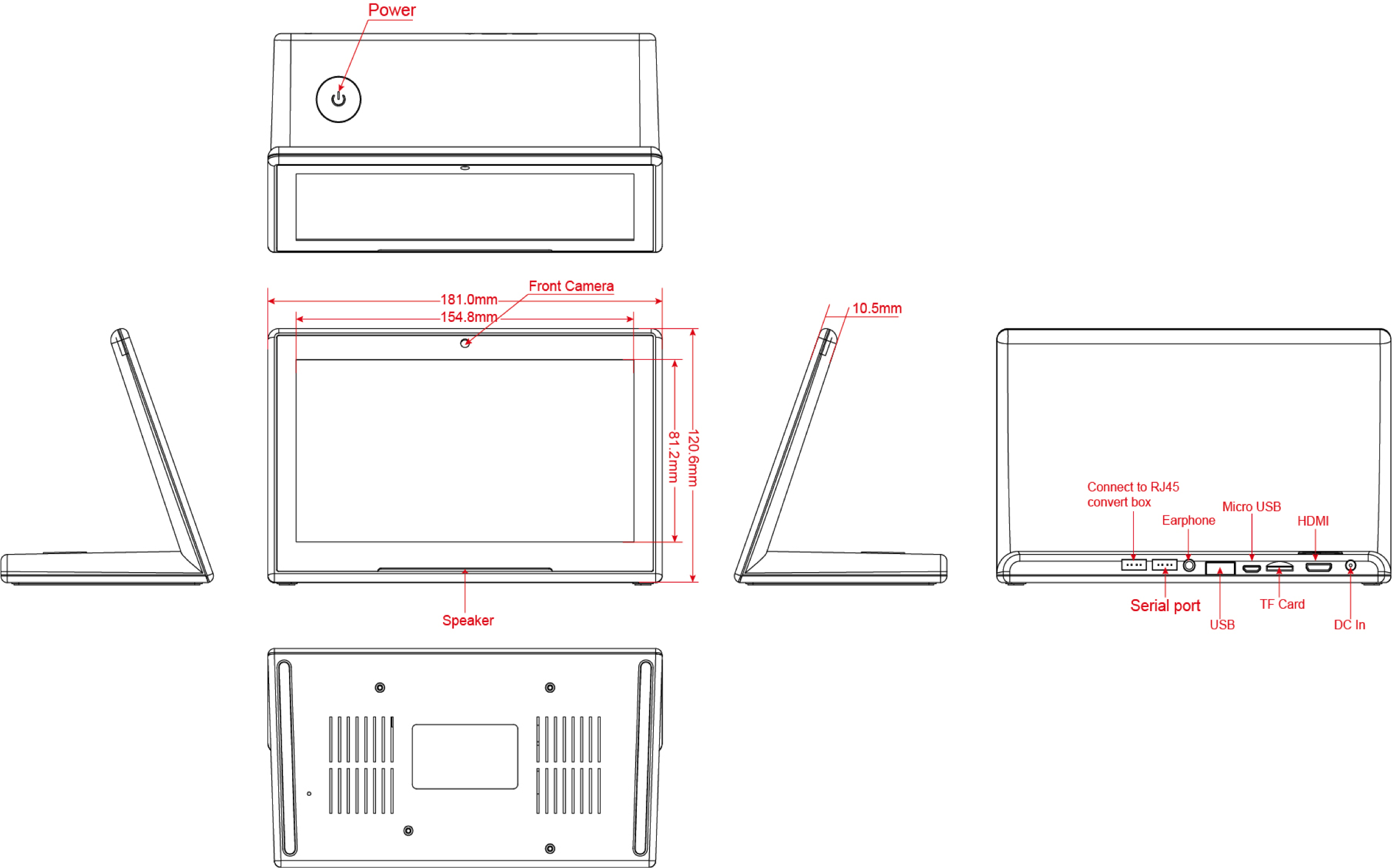 | Interface - Connection portals | HDMI OUT or TF cardreader or USB Portal or 4P-2.0mm connect to RJ45 box or Micro USB Portal or 3.5mm Jack or Power Input DC 5V/2A or Serialport: 4P-2.0mm |