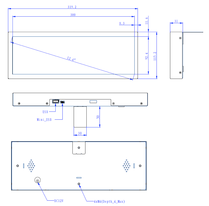 Screen size: 12.3inch, Screen type: Non-Touchscreen, Screen type: Ultra Wide, LCD Panel Type: LCD Panel, LCD Panel resolution: 1280*390, Usage: 14/7, Ratio: 16:5, Operation System: Internal VideoPlayer, Interface - Connection portals: HDMI IN, SD Cardreader, USB Portal, Mini USB Portal, Power Input DC 12V/1A, Speakers: 2*2W, Start-Up: AutoStart by plug-in the power-adapter, Accessories: Remote Control, Power Adapter, Housing type: Closed metal housing