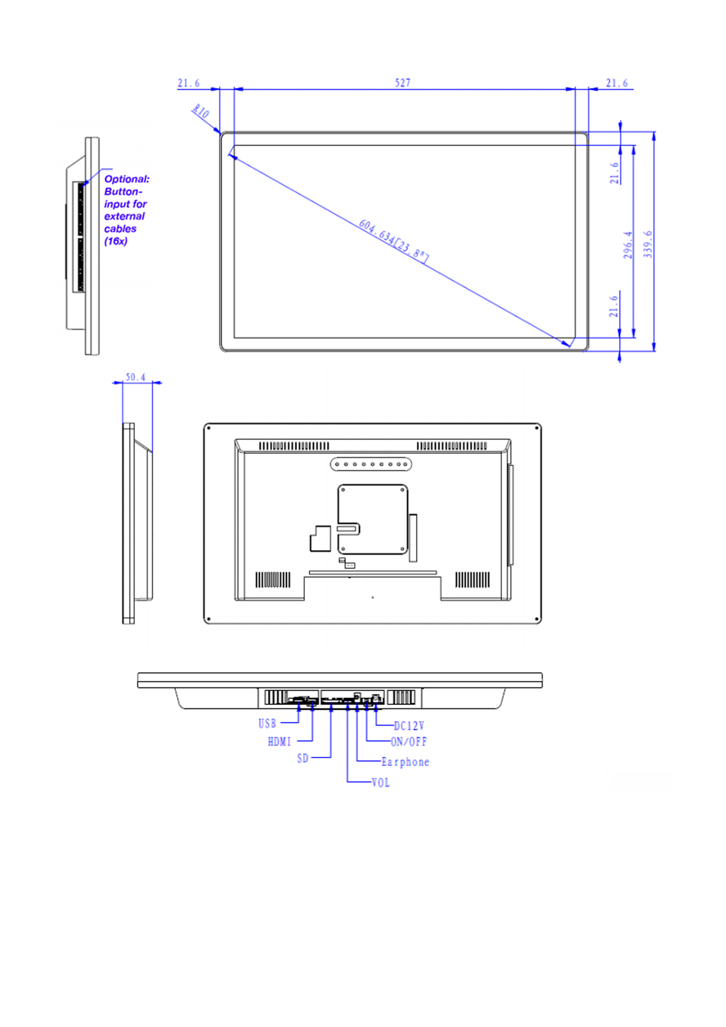 Screen size: 24inch, Screen type: LCD screen only - no touch, Interface - Connection portals: HDMI IN, Interface - Connection portals: SD Cardreader, USB Portal, 3.5mm Jack, Power Input DC 12V/1.5A, LCD Panel Type: LCD, LCD Panel resolution: 1920*1080, Function: Monitor - HDMI IN, Usage: 14/7, Addition Features: Internal Mediaplayer 1080P, PowerAdapter: AC/DC 12V/1.5A