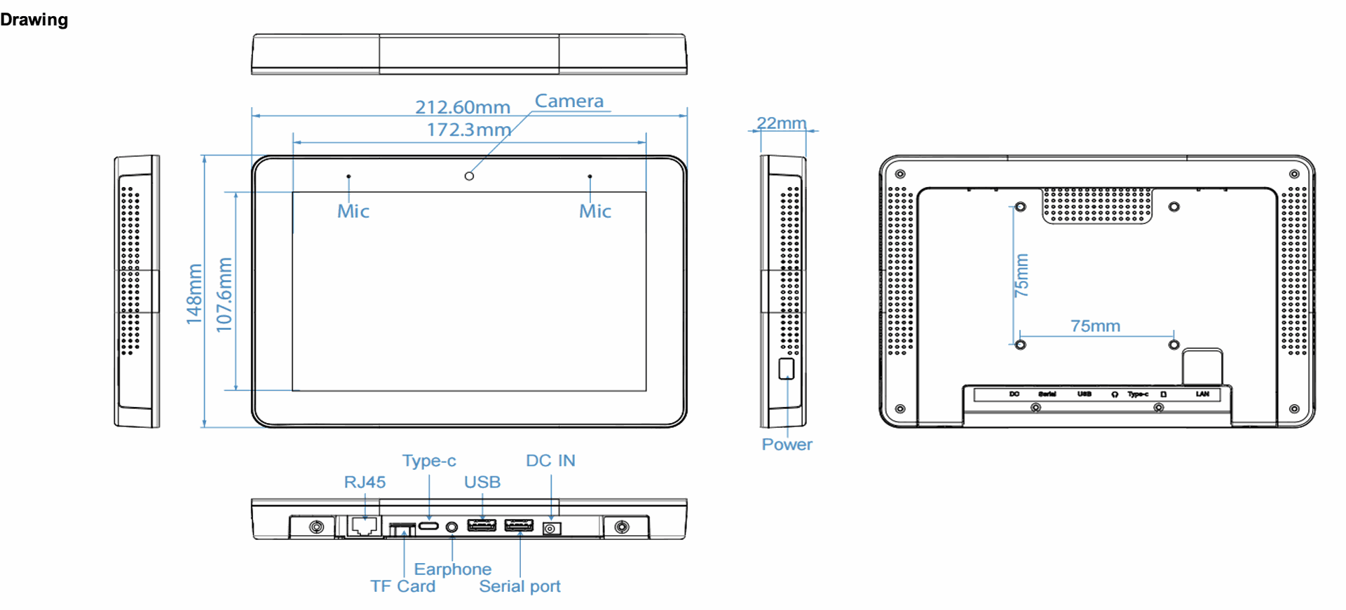 Screen size: 8inch, Screen type: Touchscreen - Capacitive, LCD Panel Type: IPS Panel, LCD Panel resolution: 1280*800, Ratio: 16:10, Optional Features: Software Systems for Digital Signage & Kiosks, Operation System: Rooted, Android 11 - RockChip RK3568, Operation System: CPU Quad Core Coretex A55, HDMI OUT, USB Portal, LAN input for Internetconnection - RJ45, Micro USB Portal, 3.5mm Jack, Power Input DC 12V/1.5A, PoE, Resolution Internal VideoPlayer: 1920*1080, Housing type: Closed Plastic Frame, Network options: Wi-Fi, LAN/WLAN, Bluetooth, Memory: RAM 2GB - Internal Memory: 16GB