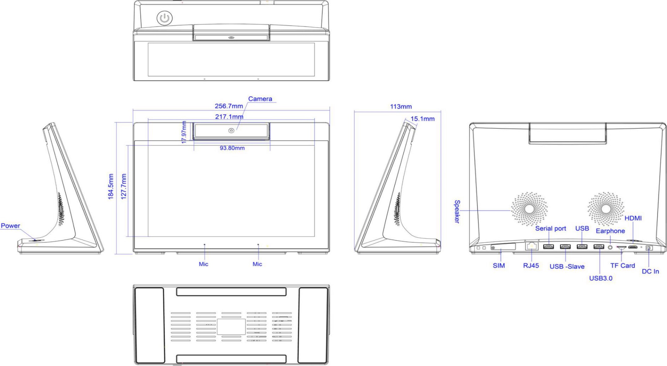 Screen size: 10.1inch, Screen type: Non-Touchscreen, LCD Panel Type: IPS Panel, LCD Panel resolution: 1280*800, Operation System: Rooted, Android 9.0 - RockChip RK3399 Quad Core Cortex A53, 1.8G, Dual Core A72, Interface - Connection portals: HDMI OUT, TF cardreader, LAN input for Internet connection - RJ45, 3.5mm Jack, Power Input DC 12V/1.5A, 2x USB 2.0, Network options: Wifi, LAN network, Bluetooth 4.0, Resolution Internal VideoPlayer: 1080P, Camera: 2.0MP front camera, Speakers: 2*2W, Mounting options: Counter Model, Start-Up: AutoStart by plug-in the power-adapter, Memory: RAM 2GB - Internal Memory: 16GB