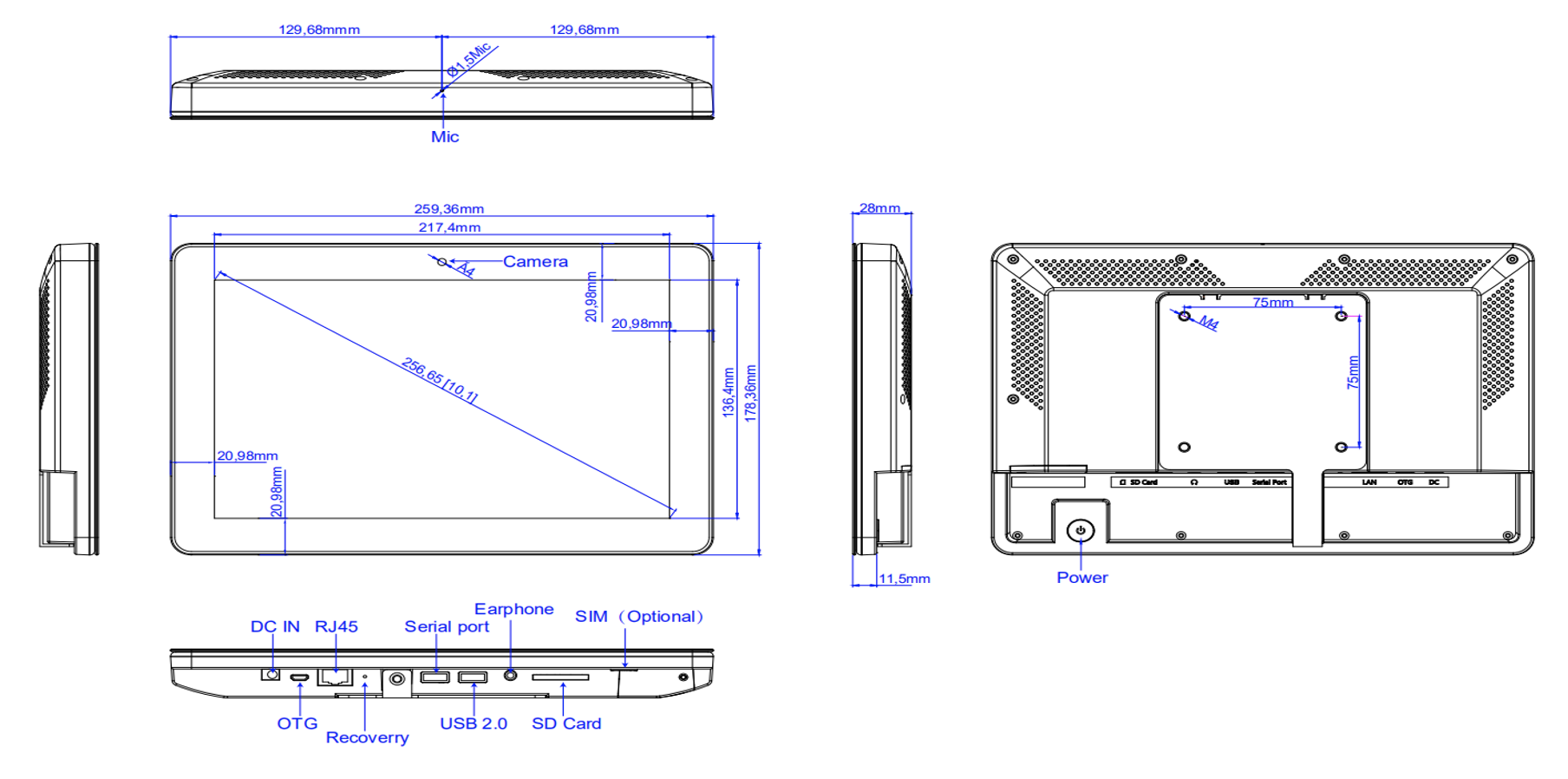 Screen size: 10.1inch, Screen type: Touchscreen - Capacitive, LCD Panel Type: IPS Panel, LCD Panel resolution: 1280*800, Ratio: 16:10, Operation System: Quad Core Cortex A17, 1.8G, Rooted, Android 10 - RockChip 3288, Interface - Connection portals: SD Cardreader, USB Portal, LAN input for Internetconnection - RJ45, Micro USB Portal, 3.5mm Jack, Power Input DC 12V/1.5A, Resolution Internal VideoPlayer: 1080P, Housing type: Black, Usage: 24/7, Network options: Wifi, LAN/WLAN, Bluetooth 4.0, Speakers: 2x3W, Mounting options: VESA 75x75mm - screwholes 4M, Memory: RAM 2GB -Internal Memory 16GB, Camera: 2.0MP front camera, PowerAdapter: AC/DC 12V/1.5A