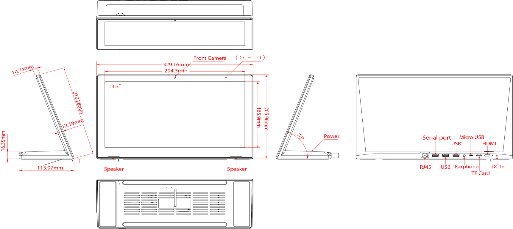 Screen type: Touchscreen, Screen size: 13.3inch, Operation System: Quad Core Cortex A17, 1.8G, Android 8.1 - RockChip RK3288, Housing type: Counter Model, LCD Panel resolution: 1920*1080, LCD Panel Type: IPS Panel, Ratio: 16:9, Interface - Connection portals: HDMI OUT, TF cardreader, USB Portal, USB for serial port, Power Input DC 12V/2A, LAN input for Internet connection - RJ45, Micro USB Portal, 3.5mm Jack, Network options: Wifi, LAN/WLAN, Bluetooth 4.0, Mounting options: Counter Model, Memory: RAM 1GB - Internal Memory 8GB, Start-Up: AutoStart by plug-in the power-adapter, Usage: 24/7, Speakers: 2*1W, Camera: 5.0MP front camera, PowerAdapter: AC/DC 12V/2A
