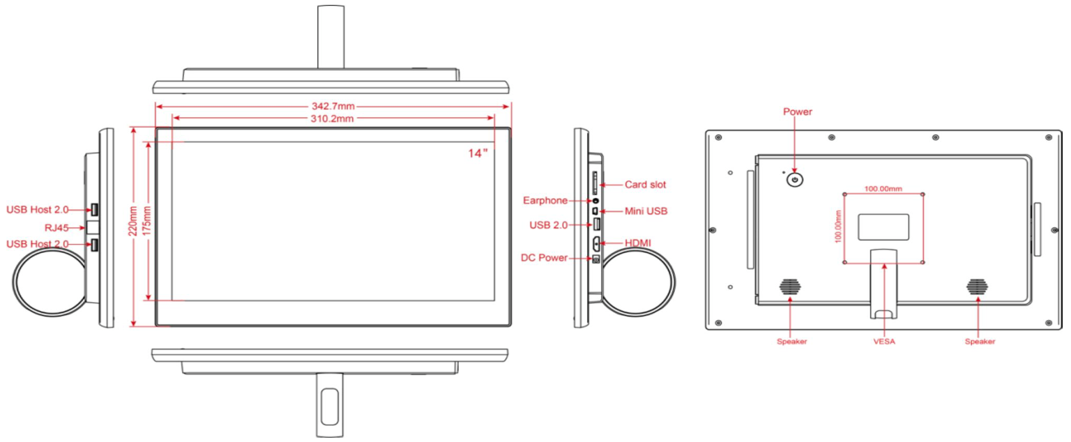 Screen type: Touchscreen - Capacitive, Operation System: Quad Core Cortex A17, 1.8G, Rooted, Android 8.1 - RockChip RK3288, Screen size: 14inch, Housing type: Closed plastic housing, LCD Panel resolution: 1920*1080, Ratio: 16:9, LCD Panel Type: IPS Panel, LCD Panel resolution: 1920*1080, Interface - Connection portals: HDMI OUT, SD/MMC Cardreader, USB Portal, Mini USB Portal, LAN input for Internet connection - RJ45, 3.5mm Jack, Network options: Wi-Fi, LAN/WLAN, Bluetooth 4.0,Mounting options: Backstand, Mounting options: VESA connection, Memory: RAM 2GB - Internal Memory: 16GB, Speakers: Internal Speakers: 2x 2W-8Ohm, Start-Up: AutoStart by plug-in the power-adapter, Camera: 2.0MP front camera, PowerAdapter: AC/DC 12V/3A, Usage: 24/7