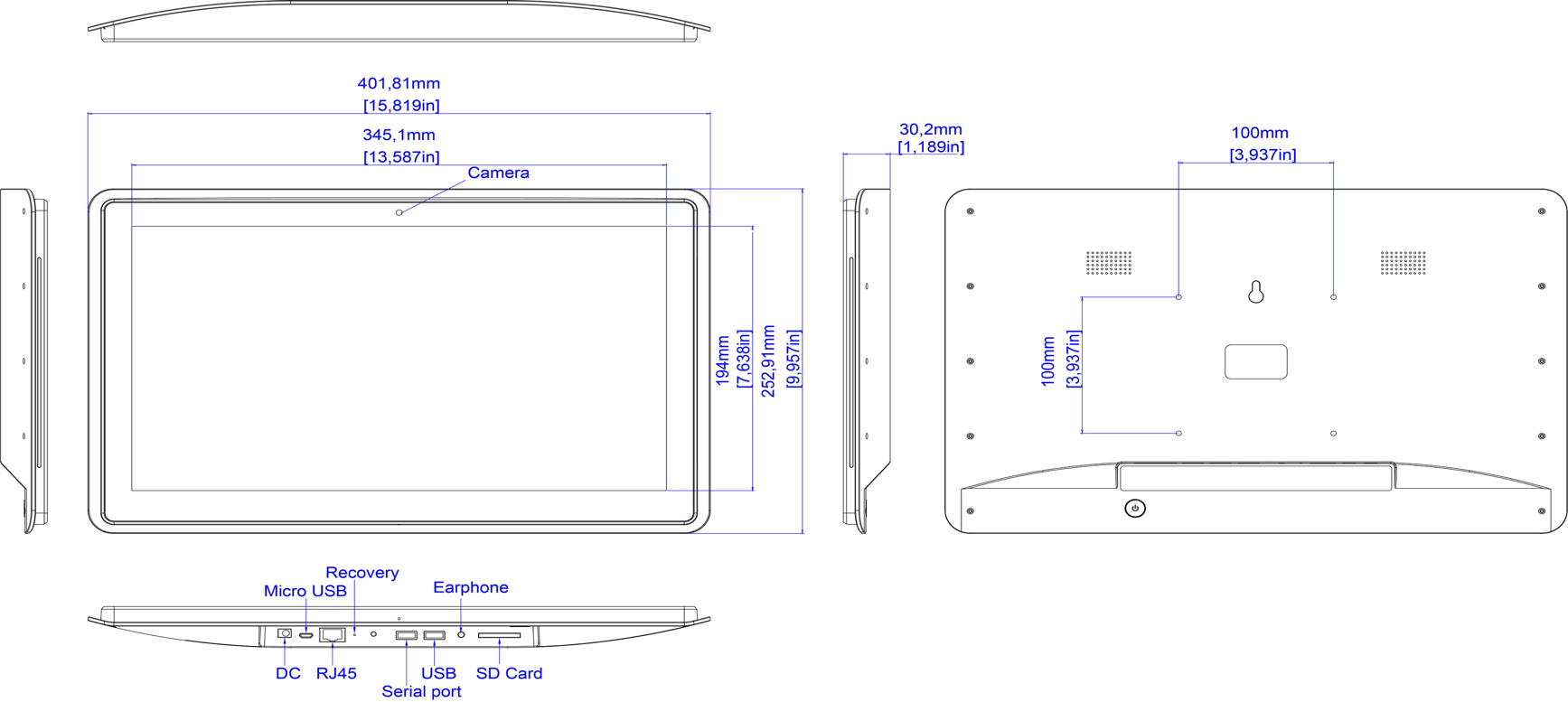 Screen size: 15.6inch, Screen type: Touchscreen - Capacitive, Operation System: Android 8.1 - Rockchip RK3288, Quad Core Cortex A17, 1.8G, Rooted, Interface - Connection portals: PoE (power over ethernet), SD Cardreader, USB Portal, LAN input for Internet connection - RJ45, Micro USB Portal, 3.5mm Jack, Power Input DC 12V/1.5A, LCD Panel Type: IPS Panel, LCD Panel resolution: 1920*1080, Memory: RAM 2GB - Internal Memory: 8GB, Resolution Internal VideoPlayer: 1080P, Ratio: 16:10, Network options: Wifi, LAN/WLAN, Bluetooth 4.0, Housing type: White - White, Speakers: 2*1.5W, PowerAdapter: AC/DC 12V/1.5A, Usage: 24/7, Camera: 2.0MP front camera, Mounting options: VESA 75x75mm - screwholes 4M