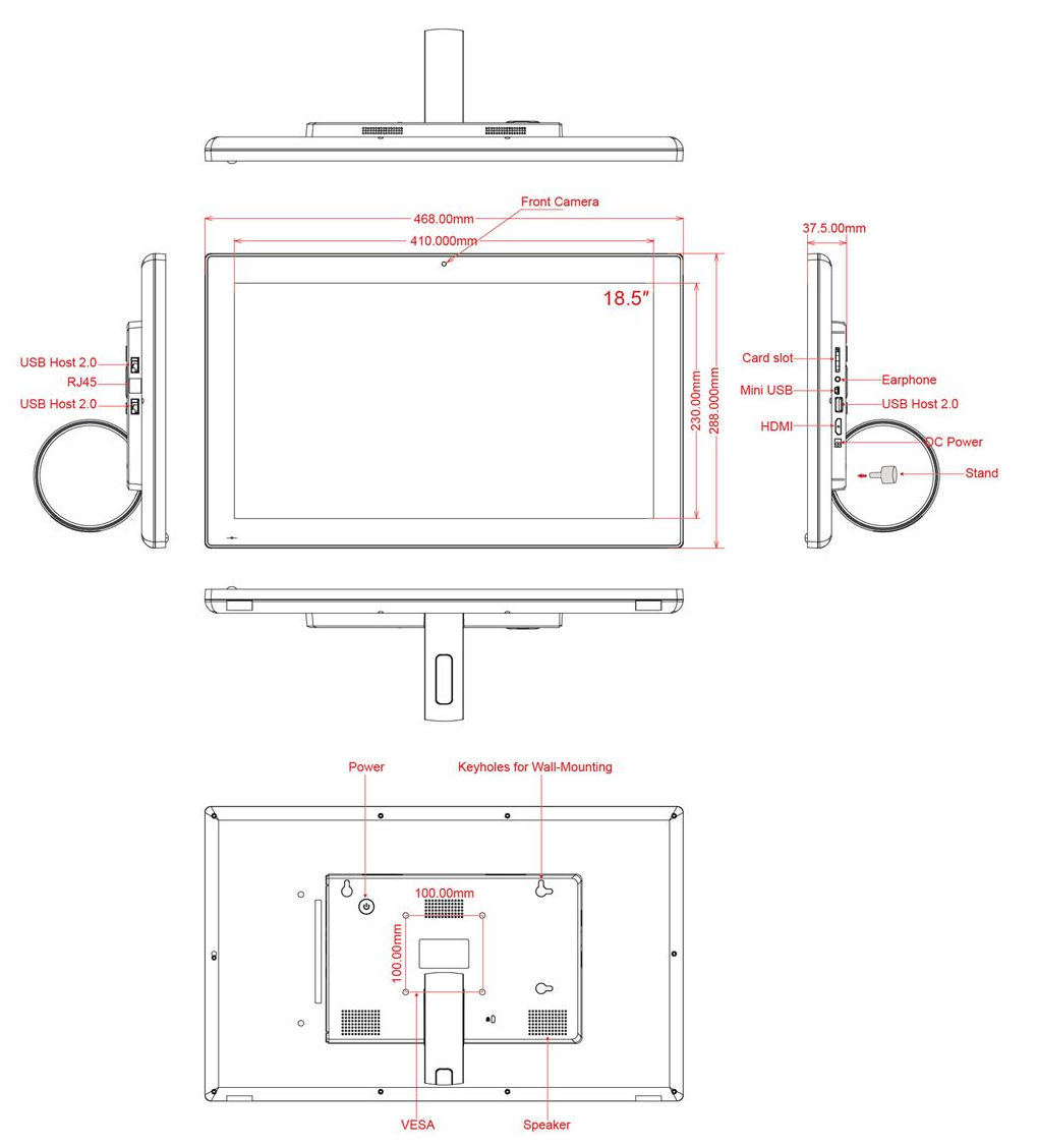 Screen type: Non-Touchscreen, Operation System & CPU: Android 8.1 - Rockchip RK3288, Rooted, Quad Core Cortex A17, 1.8G, Screen size: 18.5inch, Housing type: Closed Plastic Frame, LCD Panel resolution: 1366*768, Ratio: 16:9, LCD Panel Type: LCD, Resolution Internal VideoPlayer: 1920*1080, Interface - Connection portals: Mini USB Portal, Power Input DC 12/3A, 3.5mm Jack, SD/MMC Cardreader, USB Portal, LAN input for Internet connection - RJ45, Mounting options: VESA 75x75mm - screwholes 4mm, Backstand, Memory: RAM 2GB - Internal Memory: 16GB, Start-Up: AutoStart by plug-in the power-adapter, Usage: 24/7, Speakers: Internal Speakers: 2x 2W-8Ohm, Camera: 2.0MP front camera, PowerAdapter: AC/DC 12V/3A, Network options: LAN/WLAN, Wi-Fi, Bluetooth 4.0