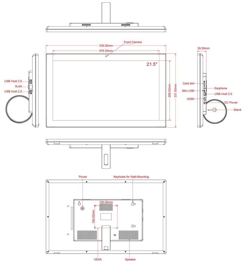 Screen type: Touchscreen - Capacitive, Operation System & CPU: Android 8.1 - Rockchip RK3288, Rooted, Quad Core Cortex A17, 1.8G, Screen size: 21.5inch, Housing type: Closed Plastic Frame, LCD Panel resolution: 1920*1080, Ratio: 16:9, LCD Panel Type: LCD, LCD Panel resolution: 1920*1080, Interface - Connection portals: LAN input for Internet connection - RJ45, Mini USB Portal, Power Input DC 12/3A, 3.5mm Jack, SD/MMC Cardreader, USB Portal, Network options: Wi-Fi, LAN/WLAN, Bluetooth 4.0, Mounting options: VESA 100x100mm - screwholes 4mm, Backstand, Memory: RAM 2GB - Internal Memory 16GB, Start-Up: AutoStart by plug-in the power-adapter, Usage: 24/7, Speakers: 2x 5W, Camera: 2.0MP front camera, PowerAdapter: AC/DC 12V/3A