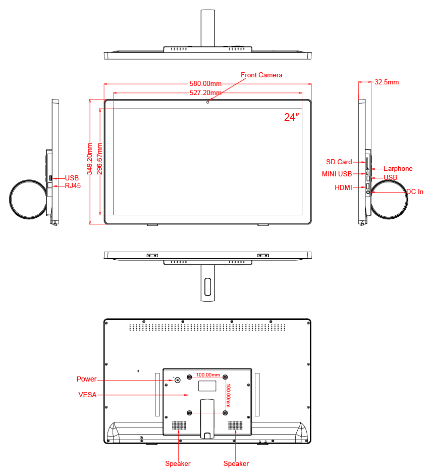 Screen type: Touchscreen - Capacitive, Operation System & CPU: Android 6.0 - Rockchip RK3288, Rooted, Quad Core Cortex A17, 1.8G, Screen size: 24inch, Housing type: Closed Plastic Frame, LCD Panel resolution: 1920*1080, Ratio: 16:9, LCD Panel Type: LCD, LCD Panel resolution: 1920*1080, Interface - Connection portals: Mini USB Portal, 3.5mm Jack, USB Portal, SD/MMC Cardreader, LAN input for Internet connection - RJ45, Power Input DC 12V/4A, Network options: Wi-Fi, LAN/WLAN, Bluetooth 4.0, Mounting options: Backstand, VESA 100x100mm - screwholes 4mm, Memory: RAM 2GB - Internal Memory: 16GB, Start-Up: AutoStart by plug-in the power-adapter, Usage: 24/7, Speakers: 2x 3W, Camera: 5.0MP front camera, PowerAdapter: AC/DC 12V/4A