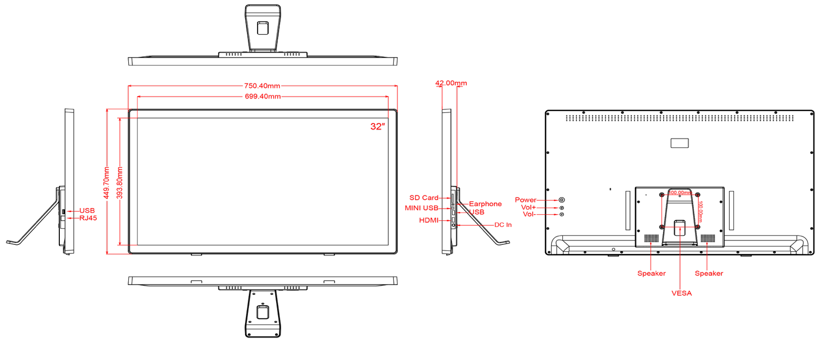 Housing type: Closed Plastic Frame, Screen size: 32inch, Screen type: Touchscreen - Capacitive, LCD Panel Type: LCD, LCD Panel resolution: 1920*1080, Resolution Internal VideoPlayer: 1920*1080, Operation System & CPU: Rooted, Dual Core A72, Quad Core A53, RockChip RK3399, Android 9.0, Memory: RAM 2GB - Internal Memory: 16GB, Network options: LAN/WLAN, Mobile Network (3G-4G) - Optional by USB SIM Dongle, Bluetooth 4.0, Wifi, Interface - Connection portals: USB Portal, Mini USB Portal, HDMI OUT, 3.5mm Jack, SD Cardreader, Power Input DC 12V/5A, LAN, Camera: 2.0MP front camera, Speakers: 2x 3W, Mounting options: VESA 100x100mm - screwholes 4mm, Ratio: 16:9, Optional Features: Software Systems for Digital Signage & Kiosks, 3G Network via USB-SimCard Dongle, Start-Up: AutoStart by plug-in the power-adapter, Usage: 14/7, PowerAdapter: AC/DC 12V/5A