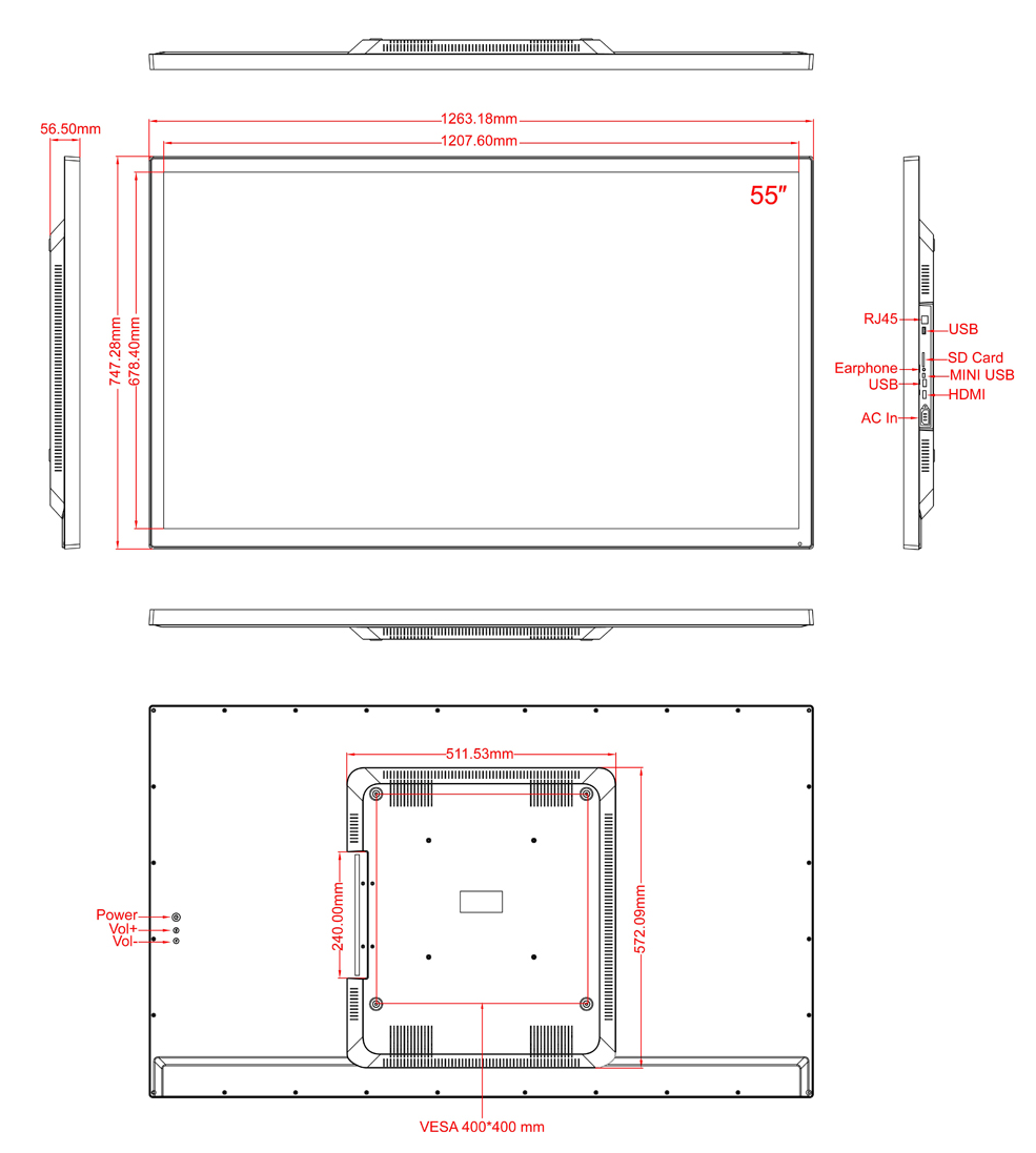 Screen type: Touchscreen - Capacitive, Operation System: Quad Core Cortex A17, 1.8G, Rooted, Android 8.1 - RockChip RK3288, Screen size: 55inch, Housing type: Closed plastic housing, LCD Panel resolution: 1920*1080, Ratio: 16:9, LCD Panel Type: LCD, LCD Panel resolution: 1920*1080, Interface - Connection portals: SD/MMC Cardreader, USB Portal, Mini USB Portal, LAN input for Internetconnection - RJ45, 3.5mm Jack, Network options: Wi-Fi, LAN/WLAN, Mobile Network (3G-4G) - Optional by USB SIM Dongle, Mounting options: VESA connection, Memory: RAM 2GB - Internal Memory: 16GB